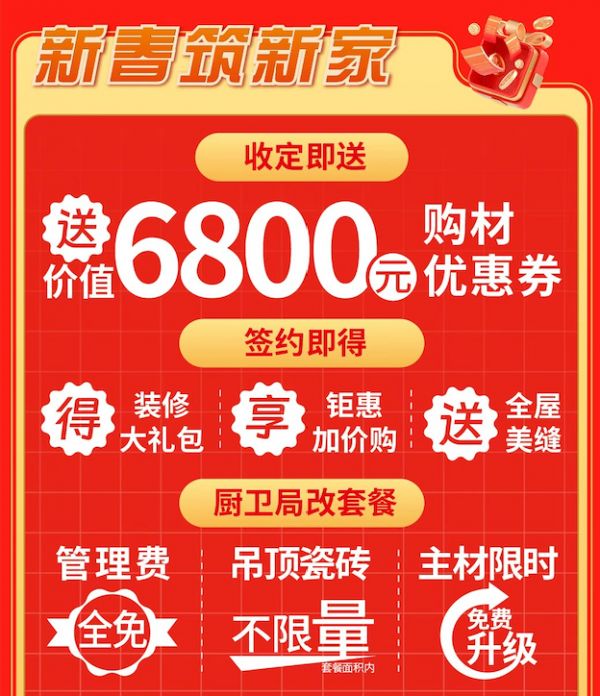 从一站式购齐的建材优惠,到省心省力的局改套餐,百安居以满满的新春诚意,为活动额外加码:提供开工钜惠提前抢,只需支付100元特权定金,即可锁定价值万元的超级券包;收定即送价值6800元购材优惠券;签约即得装修大礼包、钜惠加价购以及全屋美缝福利,为每个家庭的焕新需求量身打造解决方案。