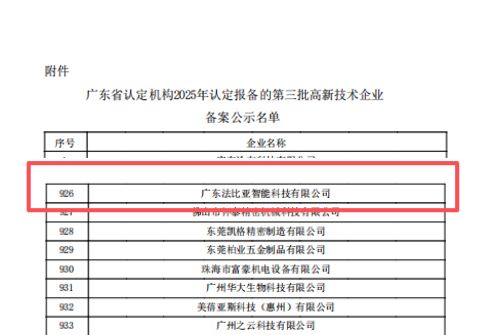 12月19日,全国高新技术企业认定管理工作领导小组办公室正式发布《对广东省认定机构2025年认定报备的第三批高新技术企业进行备案的公示》。广东法比亚智能科技有限公司凭借硬核的科技创新实力与强劲的持续发展潜力,成功通过层层严苛审核,强势跻身公示名单,即将再次荣膺“国家高新技术企业”称号!目前正处于国家高新技术企业认定平台公示阶段,这一公示结果,是国家层面对法比亚在科技创新道路上坚定探索的权威认可,更是对我们坚持创新驱动发展的最佳褒奖!