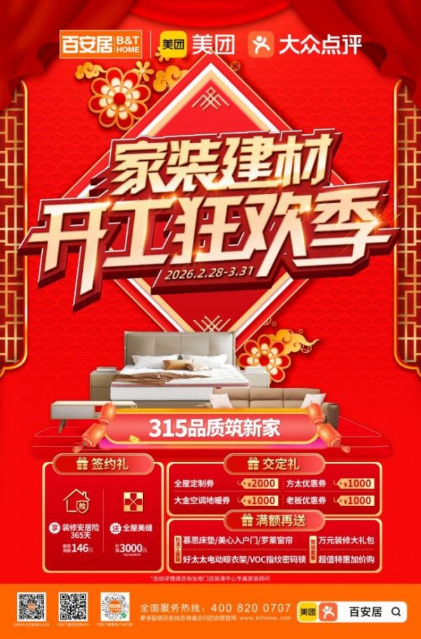 活动期间,成功签约百安居家装套餐即可享专属签约礼,不仅能拥有365天装修安居险,为家装全程保驾护航;缴纳定金可解锁丰厚交定礼,可领取各品类超千元优惠券,家装核心品类优惠一站配齐,轻松降低装修成本。超值特惠加价购等福利,让消费者花更少的钱,实现家居的焕新升级,享受更优质的家装体验与品质生活。