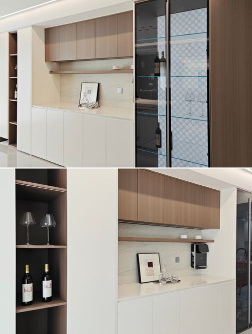 餐边柜中段留空,巧妙打造出迷你水吧。晨起一杯咖啡,仪式感瞬间拉满。右侧玻璃酒柜内置灯带,既彰显品味,又让日常使用与氛围营造兼得。