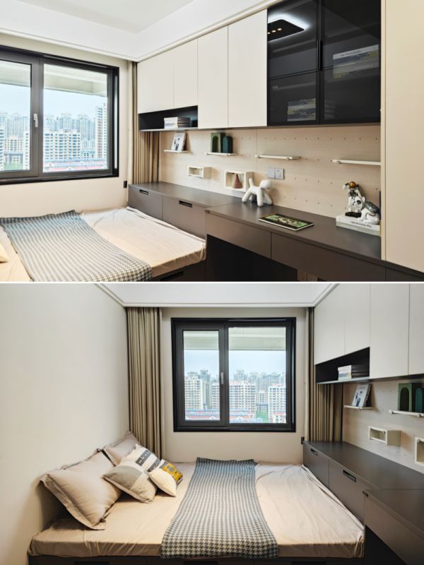 榻榻米、书桌与书柜一体组合,堪称小面积卧室的“空间魔术师”。墙面洞洞板实现精细化收纳,睡眠、学习、留宿多功能兼顾,真正实现一房多用。