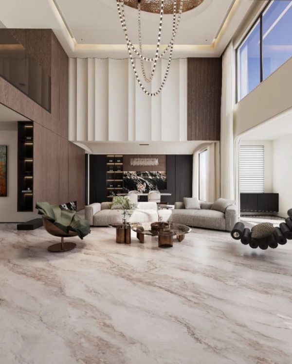 萨米特瓷砖「银河絮语-溯纹」系列的卢浮金花色,便拥有柔和的金棕暖调底色。这种色彩不像亮黄色那样张扬,而是像午后的阳光洒在大理石上,自带温暖滤镜。这种底色非常百搭:它承托得起黑檀木、深色金属的厚重感,奠定高级基调;也衬得住奶白色软装、浅色地毯的轻盈感,让空间显得柔和。