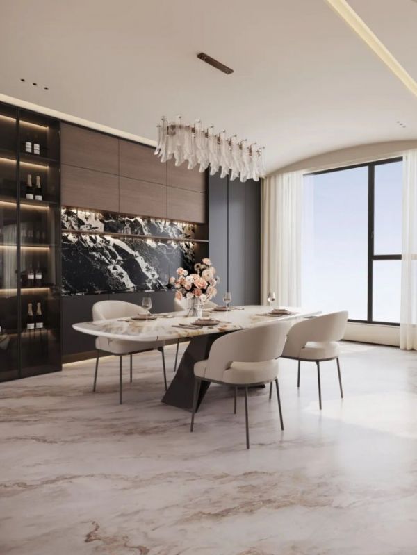 卢浮金支持小于 0.5mm的密缝铺贴工艺,搭配一石六面无限连纹设计,从入户玄关到客厅、餐厅,可实现通铺无断点,彻底消弭传统瓷砖缝隙带来的视觉割裂,让自然肌理在空间中无限延展。这种一体化的铺贴方式,不仅让整个公共区域更显通透明净,更能在视觉上拉伸空间尺度,即便是小户型客厅,也能轻松营造出开阔气场。