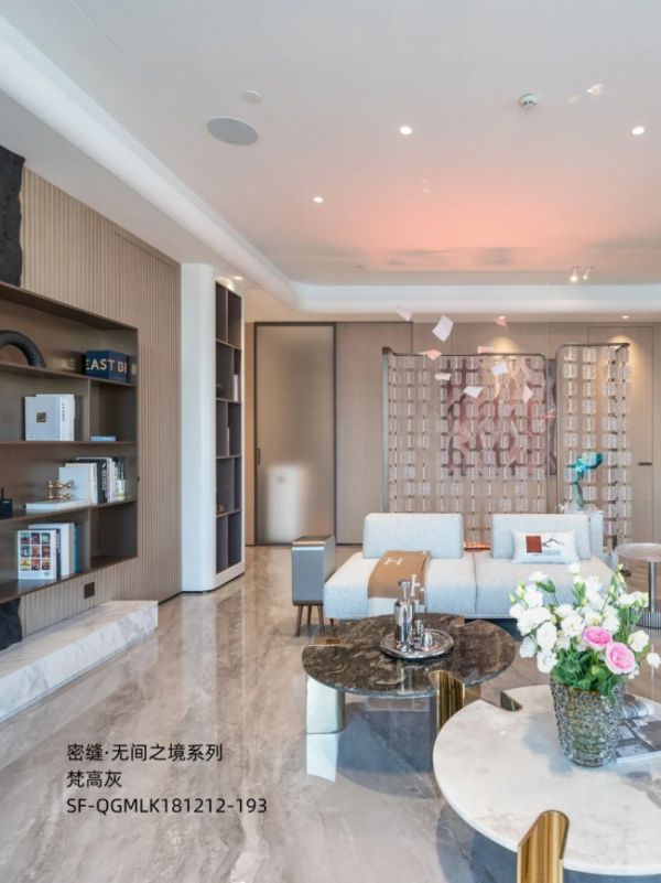 同时,梵高灰自然流畅的纹理,是通过革新干粒釉配方与超长高温烧制工艺打造而成的。其既有石材的原生肌理感,又不会过于张扬,低调中沉淀着高阶奢雅,完美适配现代轻奢的风格内核,让大宅气场浑然天成。