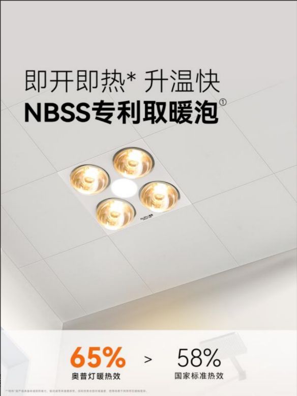 采用NBSS专利取暖泡,热效达65%,高于国家标准58%,即开即热。产品寿命长达2000小时,内部负压氮气搭配表面镀膜设计,灯泡破裂可防碎片飞溅,安全性拉满。配备高效换气通道,可快速排走雾气,整机防潮、绝缘阻燃、环保无味,适配暗卫等空间。