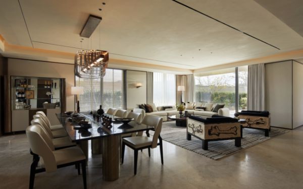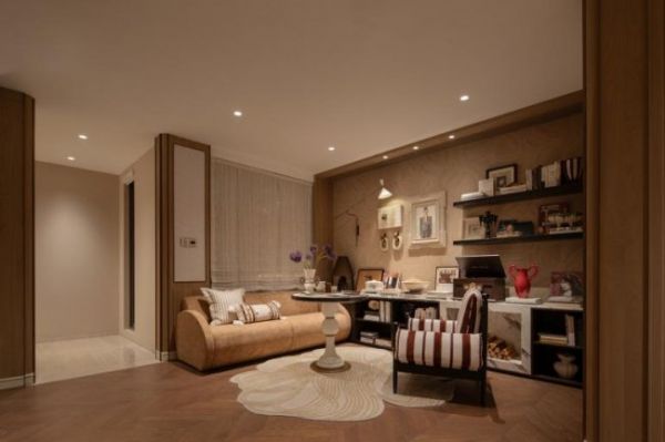 客厅在一体化布局的基础上,引入可开合隔断设计,实现室内外通透联动与私密场景灵活切换。地下室,则融入了会所功能与自然意境。依托优越挑高,上层夹层规划沉浸式空间,涵盖茶室、阅读、亲子互动与兴趣工坊,同步集中布置保姆间、洗衣房与家政间,家政动线独立闭环,最大限度减少对主人起居的干扰;下层则强化社交属性,承载会客、休闲、娱乐等多元场景。