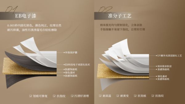 EB电子漆工艺可在0.005秒内快速固化锁色,漆面色彩纯正饱满、纹理原生自然,兼具耐污抑菌的实用性能,日常沾染油性污渍,用湿毛巾即可轻松擦拭干净,同时支持划痕修复,耐用易养护。准分子工艺依托纳米级光束均匀照射固化成型,门板立体亲肤,触碰不易留下指纹,日常清洁打理简单便捷,还具备耐高温、耐黄变的特性,长久使用依旧美观耐看。