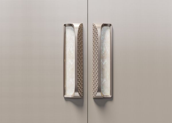 精致灰金拉手,以川渝古建双桅斗拱为灵感,将立体拱形融入绅士感的轮廓线条。表面点缀丝竹编纹理金属细节,刚柔并济;贝母纹装饰如月光映水,为灰金基调增添一抹内敛奢感。每一次开合,指间都能触碰到东方建筑的气韵与现代工艺的克制。