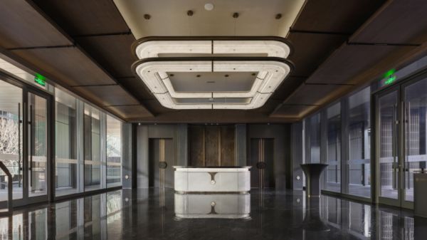 在整体空间组织上,项目没有把售楼处、公区与会所处理为彼此分离的功能容器,而是通过连续的空间叙事,把接待、停留、阅读、会谈、用餐与运动串联成完整体验路径。前厅以“山岳礼序”为开篇,通过穹顶、理石、水纹肌理、服务台、屏风与太湖石装置之间的关系,建立起更有秩序感的第一印象。这一空间的意义,不只在于审美气质的呈现,更在于帮助客户在进入项目的第一时刻,形成对品质感、归属感与项目调性的判断。