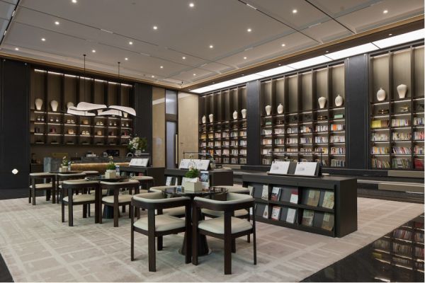 负一层书吧区,则进一步把项目的人文气质转化为可被体验的空间价值。阅读区、茶席区、水吧区与休憩区被组织为一个复合场景,目标并不是单一文化符号的展示,而是实现“可阅读、可品茶、可小聚、可独处”的真实体验。对客户来说,这里看到的不是抽象的东方意境,而是一种可以立即想象自己会如何停留、如何使用的生活方式;对甲方来说,这样的空间也更容易把品牌所倡导的高品质生活方式转化为可见、可感、可讲述的项目价值。